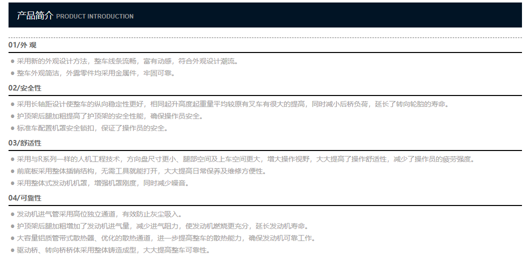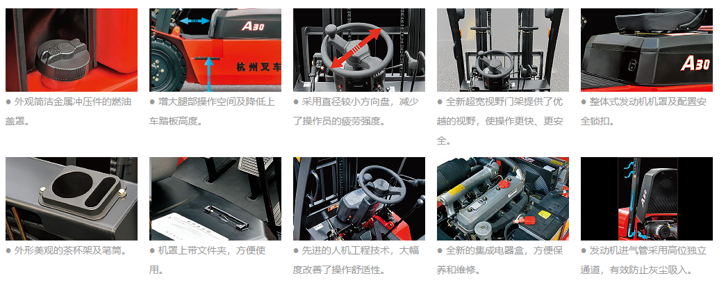 ● A系列是杭叉采用先進(jìn)技術(shù)、在原有產(chǎn)品基礎(chǔ)上,自主開發(fā)的全新系列內(nèi)燃平衡重式叉車,通過對外觀造型、安全性、舒適性及可靠性的全面升級,使整車性能較原有產(chǎn)品有了大幅度提高。