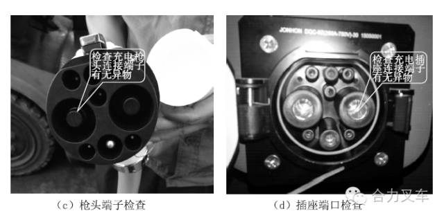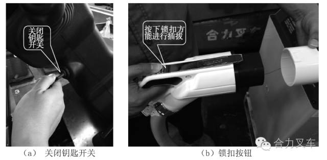 請選用合力指定的專用鋰電池充電設(shè)備進(jìn)行充電,并嚴(yán)格遵照所用充電設(shè)備的《使用維護(hù)說明書》要求進(jìn)行操作?! りP(guān)掉鑰匙開關(guān)后充電; ·請選擇在相對較安全的環(huán)境下充電(如避免有液體、火源等環(huán)境); ·充電設(shè)備周圍需配備必要的安全滅火裝置,以便在出現(xiàn)極端情況下可以進(jìn)行緊急滅火處理; ·充電前需確認(rèn)充電槍及充電插座里沒有粉塵、積水等異物,如有異物需將其清理完畢方可充電,否則會(huì)導(dǎo)致充電槍及充電插座接觸不良從而產(chǎn)生發(fā)熱甚至引起火災(zāi); ·不要修改或拆卸充電端口和充電設(shè)備,這樣可能導(dǎo)致充電故障,引起火災(zāi); ·充電結(jié)束后,不要以濕手或站在水里時(shí)去斷開充電設(shè)備,因?yàn)檫@樣可能引起電擊,造成人身傷害; ·充電結(jié)束后,請關(guān)閉車輛充電端口保護(hù)蓋,避免充電口在車輛運(yùn)行過程中進(jìn)入異物,因?yàn)檫@樣會(huì)導(dǎo)致充電口損毀?! ぎ?dāng)電池電量低于20%時(shí),應(yīng)及時(shí)補(bǔ)充充電,嚴(yán)禁電池過放電; ·電池使用后應(yīng)立即充電,充電應(yīng)充滿,但嚴(yán)禁過充電; ·為避免對充電設(shè)備造成破壞,請注意以下幾項(xiàng): a)不要在充電端口保護(hù)蓋打開的狀態(tài)下關(guān)閉充電端口艙門; b)不要用力拉或者扭轉(zhuǎn)充電電纜; c)不要使充電設(shè)備承受撞擊; d)不要在溫度高于55℃的環(huán)境下使用充電設(shè)備; e)禁止在充電設(shè)備有電流輸出時(shí)直接插拔充電槍,這樣可能會(huì)導(dǎo)致電拉弧現(xiàn)象, 造成財(cái)產(chǎn)損失及人身傷害; f)不要把充電設(shè)備放在靠近加熱器或者其他熱源的地方。 充電操作步驟: 步驟一:充電準(zhǔn)備 ?。?)確保待充電車輛鑰匙開關(guān)處于關(guān)閉狀態(tài),即整車不帶電,如圖(a)所示; ?。?)從充電設(shè)備上取下充電槍頭(注意:充電槍頭上集成有按鈕鎖扣如圖(b)必須按下才可進(jìn)行正常拔插操作),檢查充電槍及車輛端的鏗電池充電插座,確保端口內(nèi)沒有水或外來物,及金屬端子沒有生銹或者腐蝕造成的破壞或者影響,如圖(c),(d)所示;