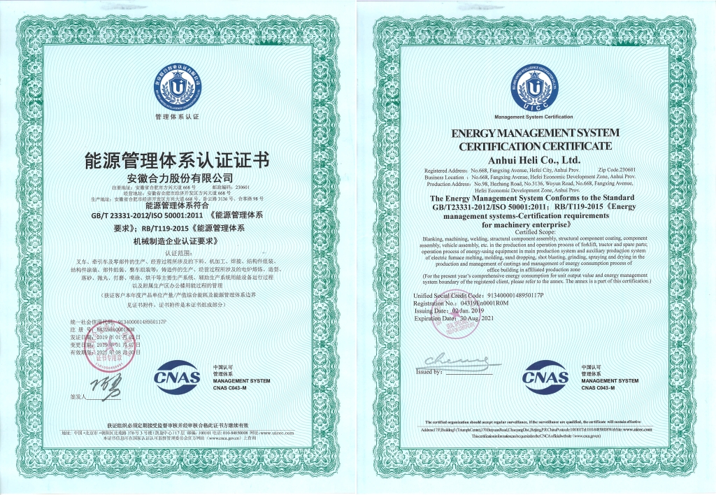 近日,安徽合力成功獲得CNCA(國家認證認可監(jiān)督管理委員會)和UICC(北京聯(lián)合智業(yè)認證有限公司)頒發(fā)的能源管理體系認證證書,公司能源管理體系的建設取得關鍵性成果。